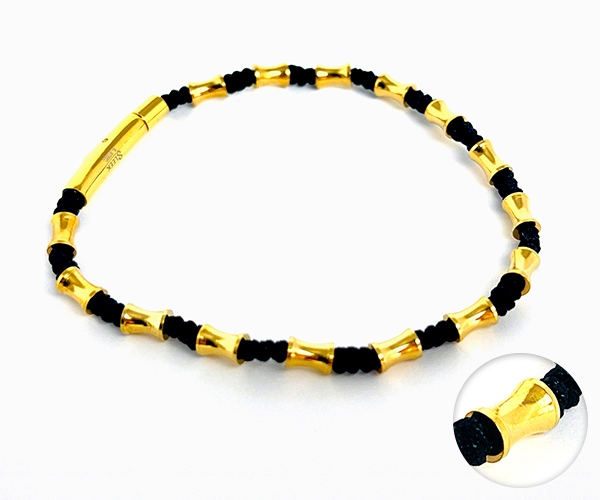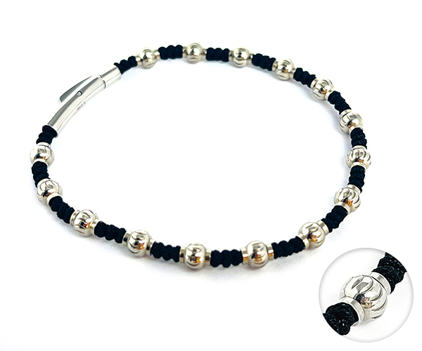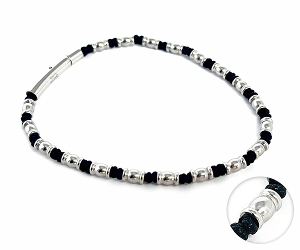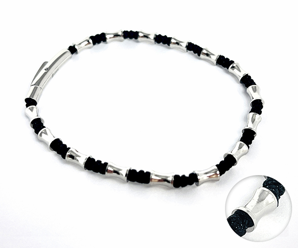 様々なフォルムのステンレスパーツをブラックコード編込んだカジュアルブレスレット。